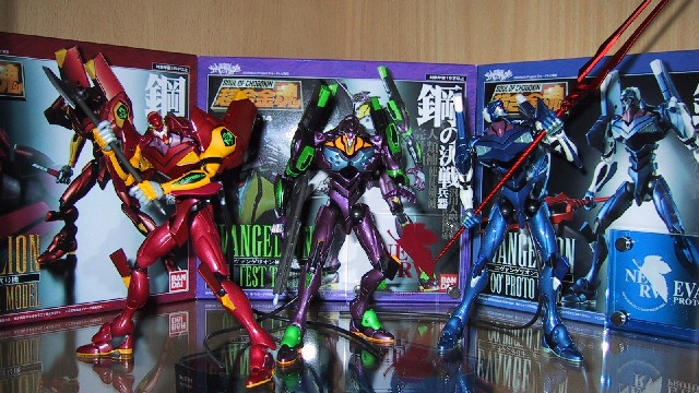 Diese wunderbaren Figuren neueren Datums zeigen die EVAs aus der Serie Neon Genesis Evangelion. Die limitierten und sehr massiv aus Druckguß gearbeiteten