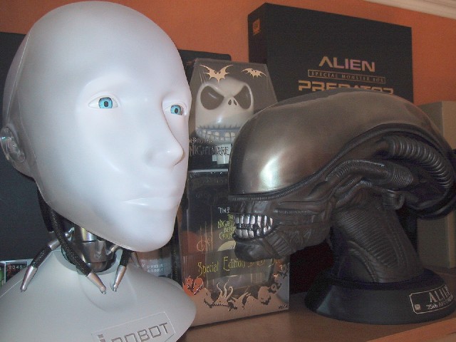 Hier ein paar ganz besondere Stücke meiner Sammlung: Links der sog. “I, Robot” Head aus Japan. In dieser Lebensgroßen Replika des Roboterkopfes aus dem Film finden die beiden DVDs der