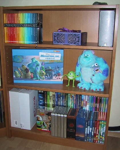 Hier zum Abschluss noch ein Blick auf das “Disney”-Regal unter dem Fernseher. Hier finden alle Filme von Disney und vor allem auch Pixar ein Zuhause. Links im Bild die limitierte japanische Box zu Monster AG neben der sich Sully und Mike aufgestellt haben. Darunter (in den weißen Kartons verpackt) die japanischen Boxen zu den Filmen, Findet Nemo und Die Unglaublichen.