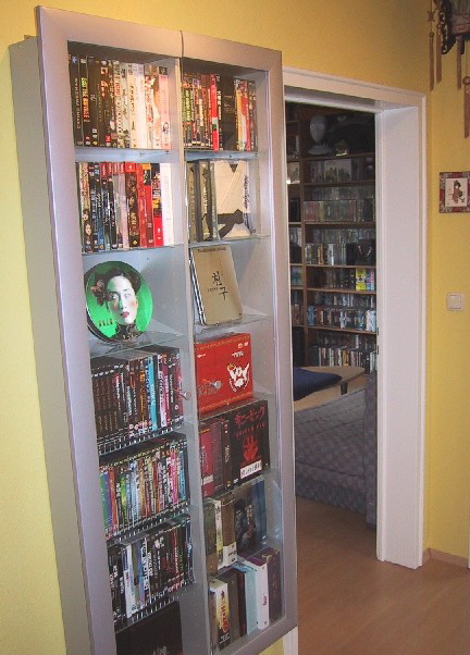 Auf dem unteren Bild sieht man die Vitrine auf der gegenüberliegenden Wand, die den Großteil meiner Sammlung asiatischer Filme beherbergt.
