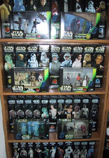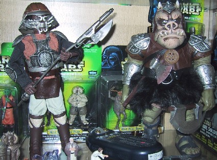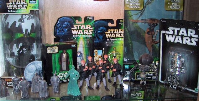 gegossene Figur “Ghost of Obi Wan”, die nur für den US Star Wars-Fanclub erhältlich war. Dahinter eine komplette “Cantina Band” und daneben der B’Omarr Monk, eine Kreatur die sich in Jabbas Palast herumtreibt (im Film “Return of the Jedi”