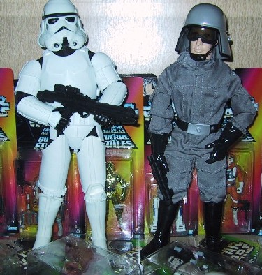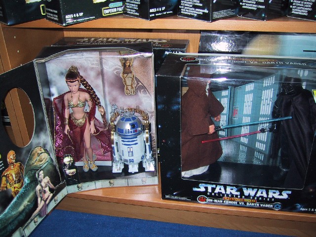 Im unteren Bild sieht man nochmal zwei besondere 12” Sets: Princessin Leia im Slave-Outfit zusammen mit R2 als “Kellner” (eine Szene aus “Return of the Jedi”) sowie Ben Kenobi und Darth Vader als elektronische Figuren, die mit Kampfgeräuschen und Sprachausgabe aufwarten können.