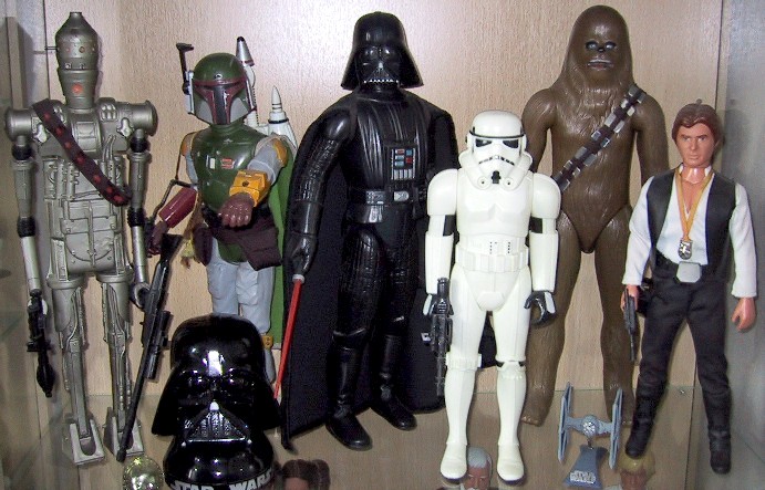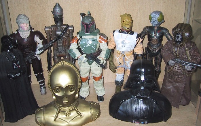 Kürzlich konnte ich über Ebay einen großen Posten 12” Figuren in Australien ersteigern. Im oberen Bild sind die Kopfgeldjäger aufgebaut, wie sie in einer Szene aus “Das Imperium schlägt zurück” zu sehen sind; (v.l.n.r.) Dengar, IG-88, Boba Fett, Bossk, 4-LOM, Zuckuss. Davor sind zwei Spardosen aus den 90er Jahren zu sehen.