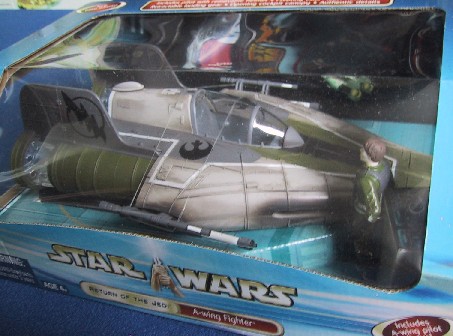 Hier ein besonderes “Sahnestück” meiner Sammlung: Ein kompletter A-Wing Kampfjäger mit Pilot aus dem Jahre 1985... Außerdem sind die Fahrzeuge Y-Wing und B-Wing zu erkennen, eingerahmt von allerlei Figuren, die hauptsächlich aus den Jahren 1978-1985 stammen (Classic-Toys der Firma Kenner).