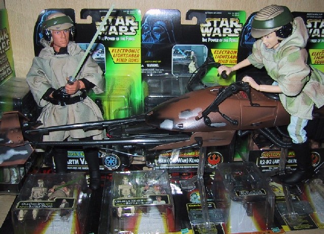 Unten ein Bild von Luke und Leia in Ihren Endor-Tarnanzügen. Leia sitzt auf einem Speederbike.