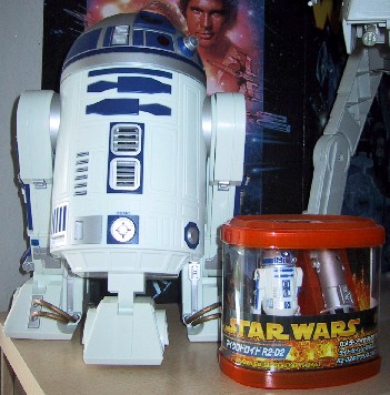 Im rechten Bild steht das ca. 40 cm hohe R2-D2 Telefon, davor der ferngesteuerte R2-D2 aus Japan.