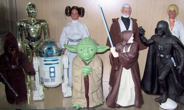 Hier geht es weiter mit Jawa, C-3PO, R2-D2, Prizessin Leia, Ben Obi-Wan Kenobi und Luke Skywalker (Der Yoda im Vordergrund gehört nicht zur Serie, er ist ein Handpuppe aus dem Jahr 1980, die aber von der Größe her sehr gut dazu paßt.) Im Vordergrund stehen noch zwei Vynilfiguren von Applause: Ben Kenobi und Darth Vader sind hier in ihrem schicksalshaften Duell verwickelt.